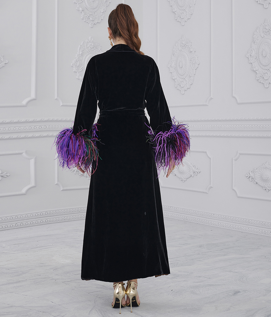 Silk velvet robe, spotted silk satin lining and detachable ostrich feather sleeves.