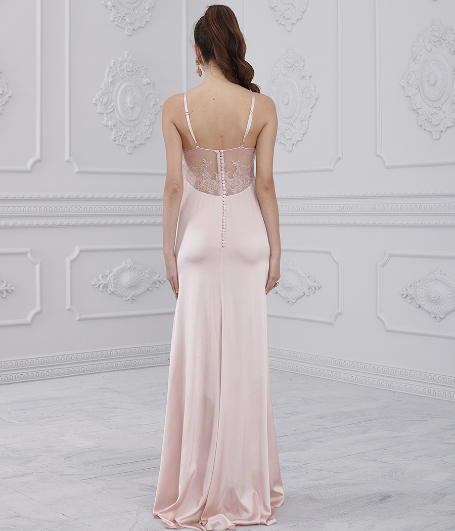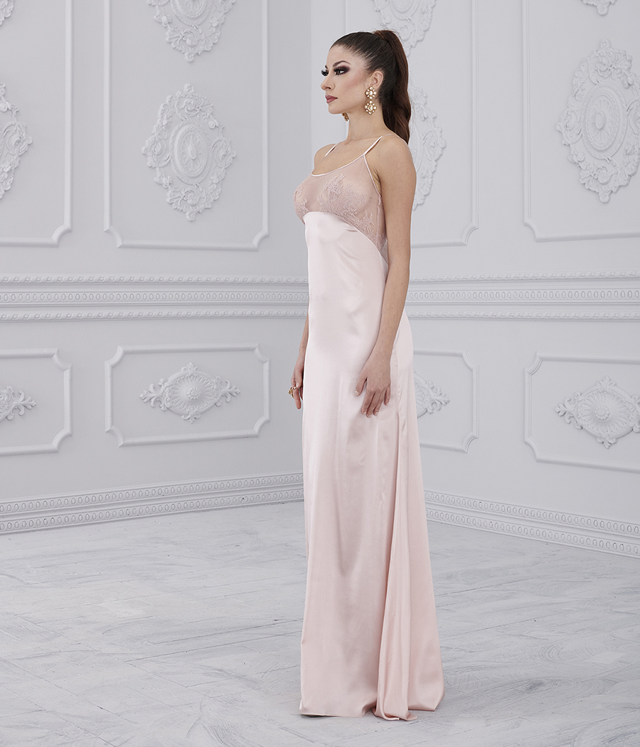 Long anotte shirt in satin and tulle with lace decoration on the bodice.