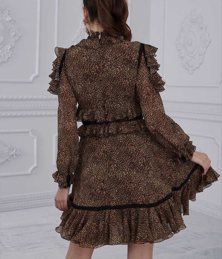 Short dress in silk mousseline with ruffles and lace trim on neckline and cuffs