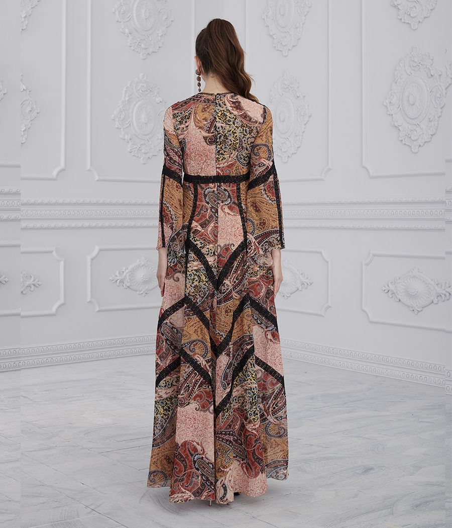 Abito lungo in seta con stampa floreale, intarsiato da linee geometriche di fasce di pizzo che dividono l'abito in sezioni.