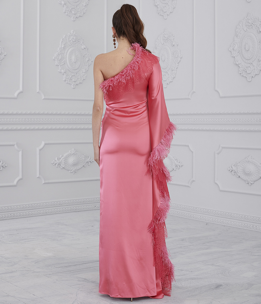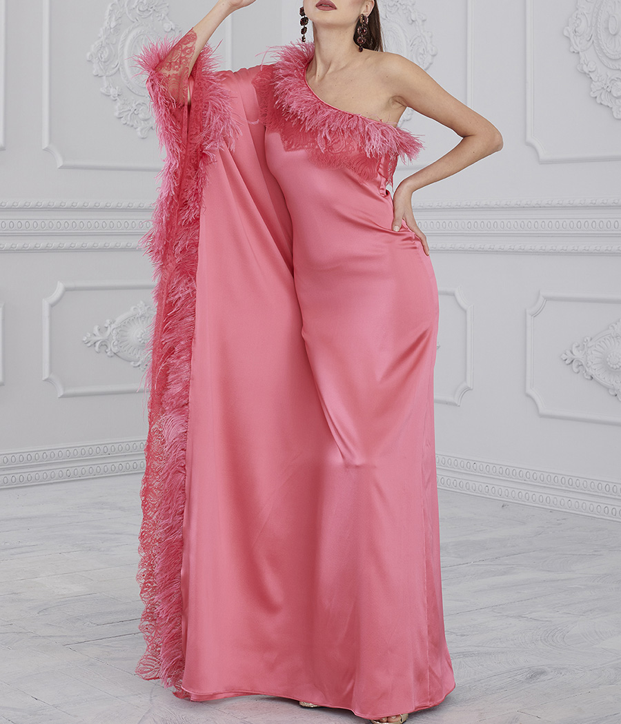Abito lungo in raso doppio di setacon pizzo e piume di struzzo.