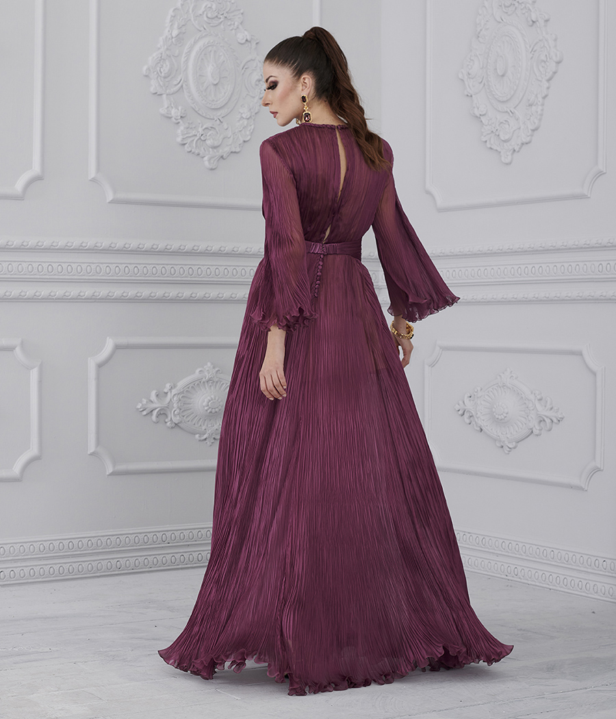Abito lungo drappeggiato a mano. Treccia decorativa sulla scollatura.